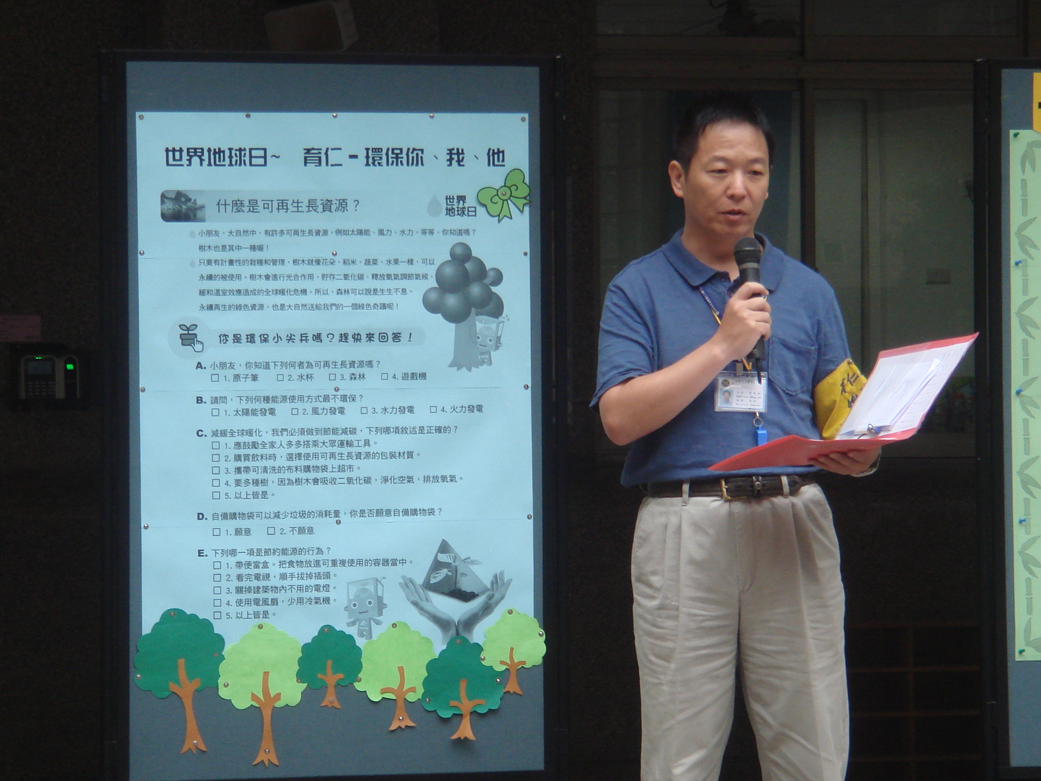 活動名稱:99學年度(下)勤學樂活、創意合作-世界地球日 育仁~環保你、 我、他~ 活動宗旨: 近來環境生態遭受破壞,造成生活環境與氣候丕變,使得環保意識抬頭。每年四月二十二是「世界地球日」,在這一天全球不分男女老少、職業種族,一起加入環保行動行列,共同保護我們的未來與地球。 「低碳家園」的使命在於為後代子孫創造新的契機,跟新的發展環境,希望能夠建立低碳新世代的共識,發展低碳化的產業結構,同時建立綠色消費的觀念,讓我們為地球環境生態貢獻一份心力。 活動日期:4月22、26日 活動時間:上午08:00~08:25 活動地點:操場及中庭朝會