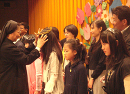 由校長為小朋友加冠並在額頭上劃十字聖號表示祝福