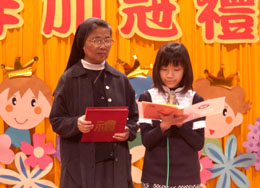 由校長為小朋友加冠並在額頭上劃十字聖號表示祝福