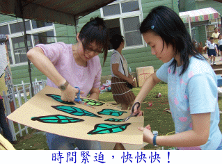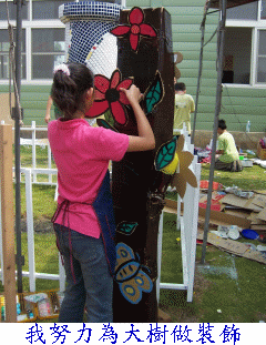 啊!已經11點半了!眼看我們交出作品的時間迫在眉睫,「快點!快點!」我瘋狂的吼叫著,看著別組的作品一一交出,我則是越來越緊張,因為我們的造型樹還缺樹葉以及花瓣,這時的剪刀又顯得特別難剪,雖然是這樣,大家仍是玩的不亦樂乎。呼!好險趕上了!......等待評審評分的時間,我們也到處欣賞著別組的作品,總覺得還是我們做的最好,不但有座華麗的宮殿,還有棵創意十足的造型樹,真棒 !要怎麼收穫,就要先那麼栽,相信我們這麼用心的製作,一定會有不錯的成績!