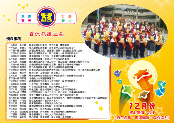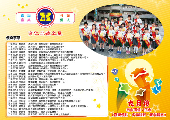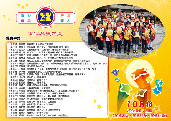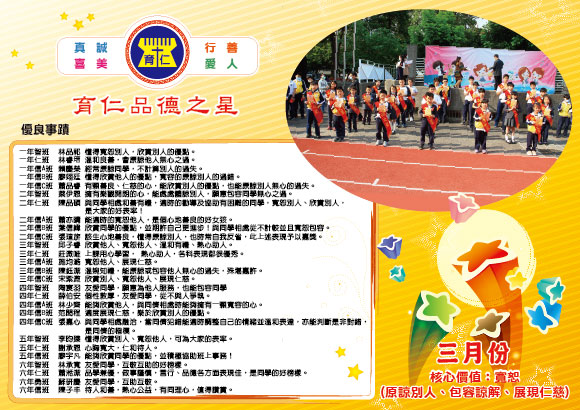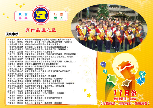 育仁小學108學年度「品德之星」實施計畫壹、依據: 一、配合教育政策,推動「品質、品德、品味」三品運動,加強品德教育,建構友善校園。 貳、目標: 一、協助學生了解自己的各種能力、性向、興趣及人格特質。 参、實施辦法: 一、規劃每月生活品德核心價值及行為準則為評選標準。