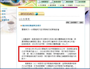 為了讓網頁內容更加豐富,老師說要擬訂幾個參訪的行程,讓我們在暑假就能先做採訪。今天正好搜尋到台中市在93年時成立了五隊的河川巡守隊,符合融入社區服務的志工精神,所以我們要來聯絡這五個里的里長和志工,找個時間,讓大家可以校外參觀採訪。by 林于晴
