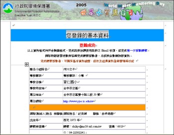 之前盧老師從環保署得知此活動訊息,就馬上上網去查詢後,找自然老師紀良穎討論,因為他們之前科展的內容主要是水質檢測,請求協助當我們的領隊老師,在徵求同意後報名參加,參加資料如下:隊伍名稱-河川之子,監測地點-旱溪東門橋下。by 林于晴