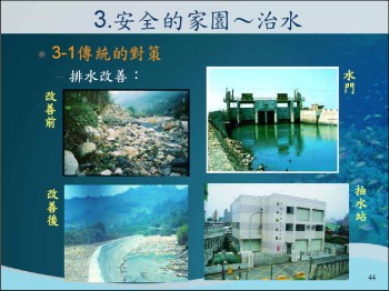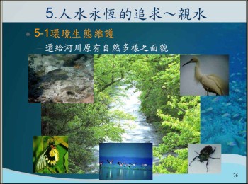 前天太忙了,只寫了一點心得,有點對不起老師,趕快補上我的上課心得^_^!經濟政策遇上環保問題時,在過去的社會,總是會取經濟而捨環保,因此全球普遍發生土地過度開發的現象,連我們的鄰居日本也不例外,一旦過度開發,大自然被破壞後,整個水利環境變得複雜許多,一來容易引發洪流,河川遭受污染,親水的空間也進而縮小,所以政府在這幾年做了許多的治水之道,這些努力需要我們一起來實行,加油囉!by林于晴