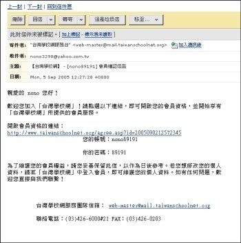 前幾天老師叫我們加入台灣學校網,但我們連續幾天都沒收到確認信,老師便打電話到網界博覽會詢問,在經大會的測試後,今天我又迫不及待的上網看信箱,YA!終於收到確認信了,我趕快打開信件並點選確認超連結,呼終於弄好了,成為台灣學校網的會員了!by陳琬婷