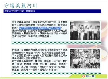 當老師交代我要製作橫幅時,心裡高興了一會兒,因為這種小事對我而言,很容易達成。以前就愛畫畫,所以到五年級學到Photo Impact,很多工具可以創作出漂亮的圖形時,我開始很喜歡上電腦課,還參加暑期電腦研習營,期待老師能讓我參加網頁比賽,果然我的努力沒白費,他們交代的工作,我不敢忘記,也很認真的如期完成!做橫幅其實不難,只要將文字和插圖配合應用適當,然後美化文字特效,畫出和河川有關的東西,自然可以做出美美的作品,不過老師對美的要求相當嚴格,要令她們滿意,可真是有點難喔! by黃亭語