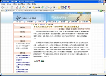 今天在上網搜尋時,在台中市政府的新聞中看到一則11月5日舉辦水土保持全民宣導的活動,因為河川和水土保持有間接關係便打電話去市政府詢問,市府的人員很熱心的將邀請卡傳真給我們,內容最主要是遊戲和寫生,所以覺得不適合參加,另外還告訴我們,台中市政府有和中興大學水土保持學系合作,蒞校宣導演講完全免費,聽完之後覺得很好,再找個時間和學校討論,看是否可以請中興大學蒞校為學生做校園水土保持教育宣導。By盧書錦