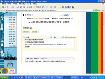 隔天,我去收信時,發現了有人回答,我就進去看看,結果,對於他的答案本來不是很滿意,但在仔細閱讀後,我整理內容並吸收,實在是很感謝他的回答,讓我們的網頁製作能更順利,也因此我真正瞭解網路的便利性,倘使大家也能善用網路資源,網路的效率會越來越高! by傅悅