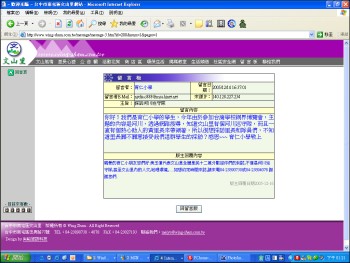 老師要我們拿台灣網界博覽會的未成年學生同意書讓監護人同意,內容寫同意依參賽人意願決定是否將其個人身分資料公佈在大會比賽網站上,而「參賽人」就是我們這些辛辛苦苦做網站的小朋友們,內容還有許多,最重要的就是我們要共同維護網路禮節及秩序、遵守國家相關網路及著作權法令,最後讓監護人簽名,交給老師就完成了。因此這項工作根本不是難事,不過要少叫我寫進度報告,多讓我畫畫吧!by周怡廷