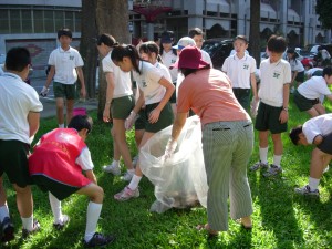 「懷抱泥土的芬芳、綠化社區的環境」是培養學童愛護地球村生態文化的開始,育仁小學坐落在寬60米的綠園大道旁,終年綠葉扶疏、綠意盎然,不僅是育仁學童生態觀賞區,同時也是社區居民晨起運動及茶餘飯後論天說地的休閒區,為了做好敦親睦鄰,培養學童愛鄉土的情操,同時練就未來融入社區、步入社會應有的生活態度,育仁學童運用綜合活動課程,排定社區服務的時間,除了定期清理園道週遭的垃圾外,當綠園道落葉較多的季節,還會安排小志工協同社區清除落葉枯枝的服務,藉此訓練學生分工合作的的理念,儲備來日為社會服務的熱忱。