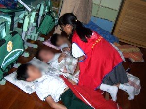 雖然每天做的事情都差不多,但是「狀況」卻是都不一樣。今天的狀況很特別:小政無論刷牙洗臉,都會一直掙扎,且還把牙膏、漱口的自來水全都吞了下去,讓我覺得有點噁心,但是沒有辦法,只好去找他們老師。他們老師說:「如果他在喝漱口的水,你就把他的頭向前傾,讓水從嘴邊流下。」至於吞牙膏嘛!似乎連老師也沒輒了。