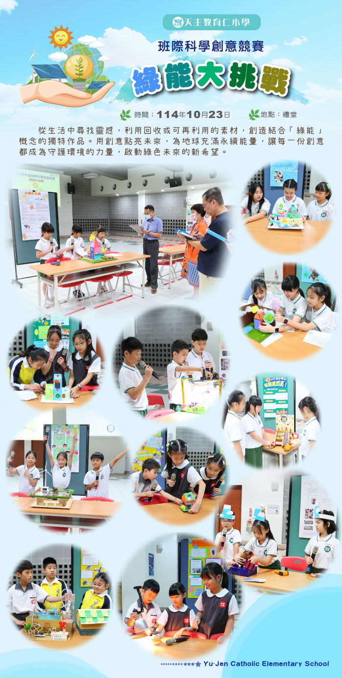 天主教育仁小學超級馬力,風馳電掣,科學創意競賽。使用回收、可再利用或隨手可得之材料,運用創意設計,做出堅固創新的作品。成果必須是自行創作及製作,並將馬達應用在作品上。中年級組、高年級組
